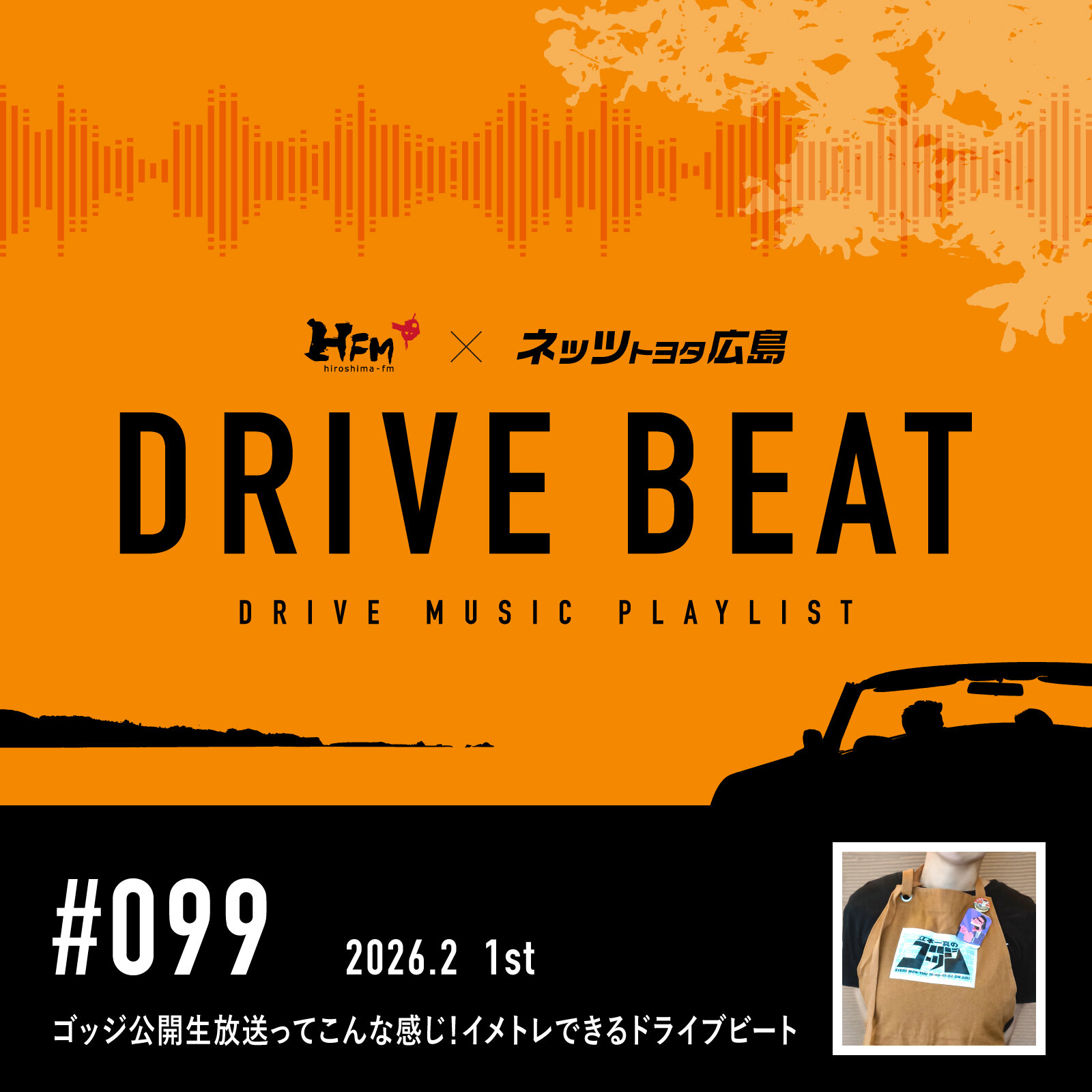 「江本一真のゴッジ」は月に一度、広島本通りで公開生放送をしています。「ラジオ」が目の前にあらわれる臨場感バチバチの時間ですが初めての参加は不安ですよね。ということで普段のドライブで公開生を体感できるドライブビートをご用意しました。公開生も選曲もカロリー高め要注意?でも魅力たっぷりのはず!参加したくなってくれたら嬉しいです。